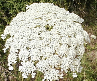 Queen Anne's Lace, Daucus carota, also known as wild carrot. Similar in appearance to the deadly poison hemlock, Queen Anne's Lace is distinguished by fine hairs on its solid green stems, a root that smells like carrots, and occasionally a single dark red flower in the center of white flowers. Just remember, "The queen has hairy legs." Also poison hemlock has red/purple splotches on its stem, "The blood of its victims."