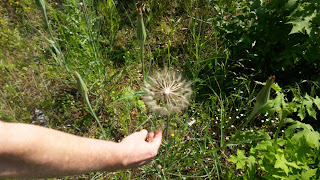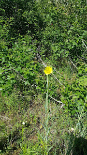 Wild Salsify, Tragopogon dubius, also known as western or yellow salsify and Goat's Beard. Its nickname is Johnny-Go-To-Bed-At-Noon because the flowers open in the morning and close at mid-day because of the heat. It is a close cousin to dandelion. It is a hardy annual and not shade tolerant. It loves poor soil. When going to seed it looks like a giant dandelion seed head.
